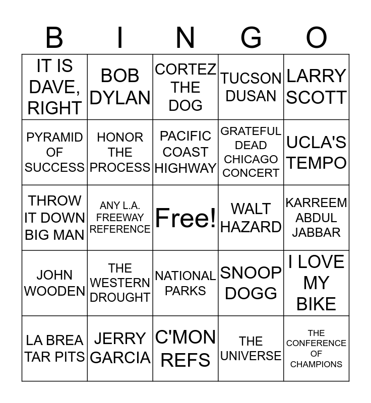 This bingo card has a free space and 24 words: THE WESTERN DROUGHT, JERRY GARCIA, PACIFIC COAST HIGHWAY, LA BREA TAR PITS, LARRY SCOTT, IT IS DAVE, RIGHT, PYRAMID OF SUCCESS, BOB DYLAN, WALT HAZARD, NATIONAL PARKS, GRATEFUL DEAD CHICAGO CONCERT, THROW IT DOWN BIG MAN, SNOOP DOGG, I LOVE MY BIKE, HONOR THE PROCESS, THE UNIVERSE, KARREEM ABDUL JABBAR, CORTEZ THE DOG, UCLA'S TEMPO, ANY L.A. FREEWAY REFERENCE, THE CONFERENCE OF CHAMPIONS, JOHN WOODEN, TUCSON DUSAN and C'MON REFS.
