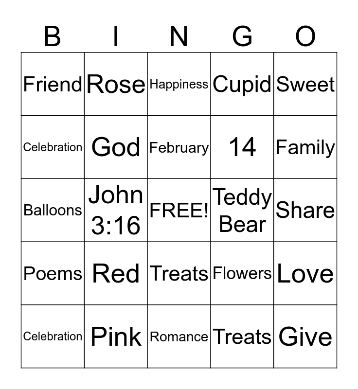This bingo card has a free space and 24 words: Red, Pink, February, Celebration, Sweet, Friend, Celebration, Rose, Teddy Bear, Treats, 14, Balloons, Flowers, Love, God, Treats, Share, Happiness, Family, John 3:16, Give, Poems, Cupid and Romance.
