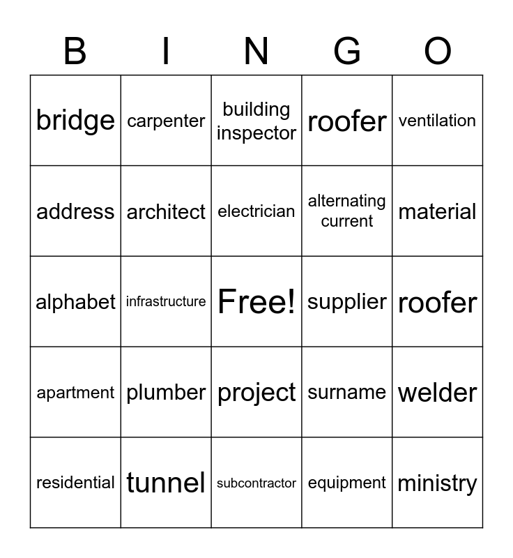 This bingo card has a free space and 29 words: residential, sector, infrastructure, flyover, bridge, building inspector, architect, plumber, supplier, tunnel, roofer, ministry, subcontractor, equipment, material, site, project, apartment, ventilation, alphabet, surname, excavator, alternating current, address, roofer, carpenter, welder, electrician and painter.
