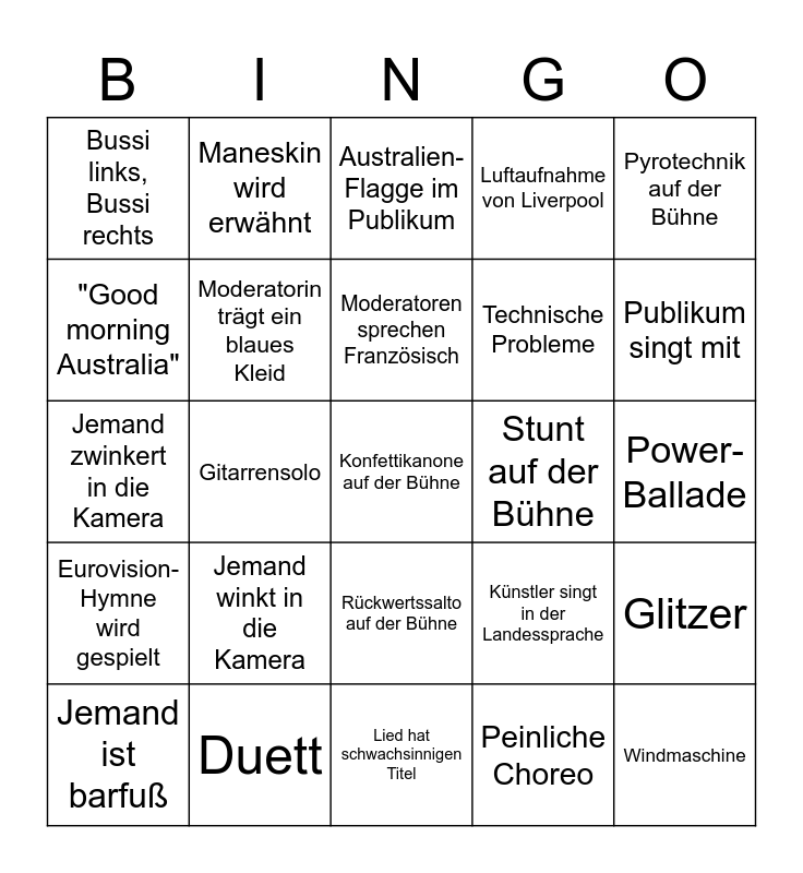 This bingo card has 39 words: Free!, Schlagzeugsolo, Sängerin wird in die Höhe gehoben, Moderatorin trägt ein blaues Kleid, Jemand ist barfuß, Rückwertssalto auf der Bühne, Moderatoren sprechen Französisch, Schweiz-Flagge im Publikum, Pyrotechnik auf der Bühne, Eurovision-Hymne wird gespielt, Gitarrensolo, Luftaufnahme von Liverpool, Konfettikanone auf der Bühne, Power-Ballade, Stunt auf der Bühne, Jemand winkt in die Kamera, Sänger mit freiem Oberkörper, Bussi links, Bussi rechts, Nebelmaschine, Künstler singt in der Landessprache, "Good morning Australia", Lied hat schwachsinnigen Titel, Technische Probleme, Publikum singt mit, Jemand trägt ein weißes Kleid, Moderatoren singen, Windmaschine, Es regnet auf der Bühne, Halbnackte Tänzer*innen, Maneskin wird erwähnt, Musiker mit traditionellem Instrument, Saxophon-Solo, Australien-Flagge im Publikum, Duett, Peinliche Choreo, Eiffelturm im Bild, Glitzer, Jemand zwinkert in die Kamera and Mehrsprachiges Lied.