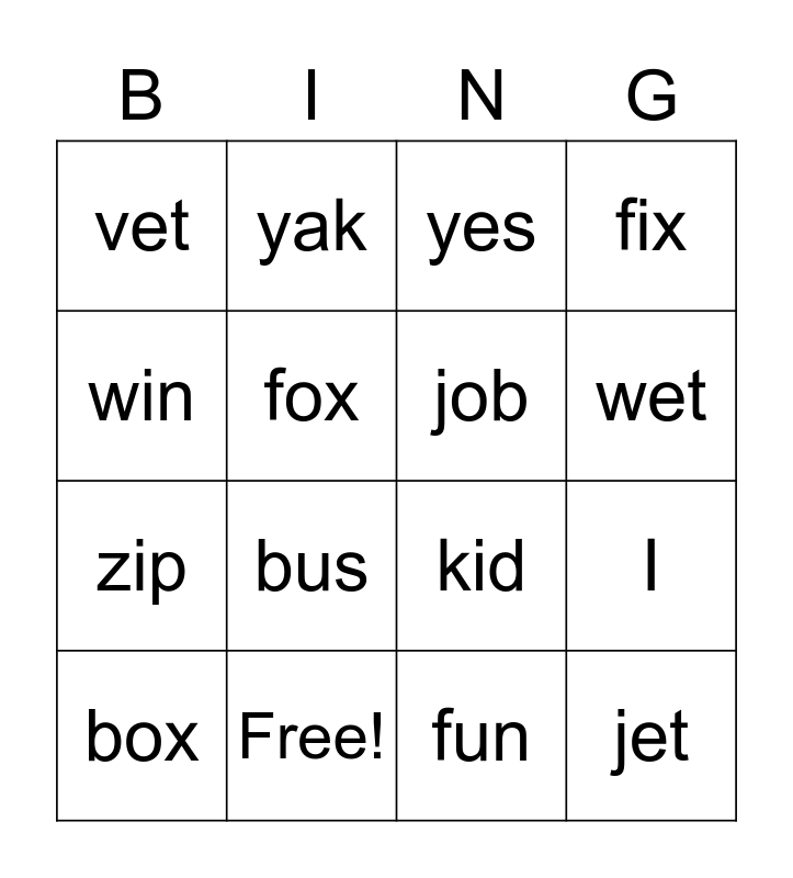 This bingo card has 16 words: Free!, I, yes, vet, zip, yak, kid, fun, win, fox, box, fix, bus, wet, job and jet.