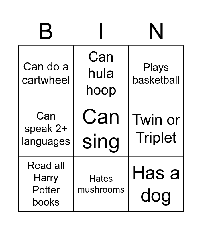 This bingo card has a free space and 8 words: Twin or Triplet, Plays basketball, Can hula hoop, Read all Harry Potter books, Can do a cartwheel, Has a dog, Can speak 2+ languages and Hates mushrooms.