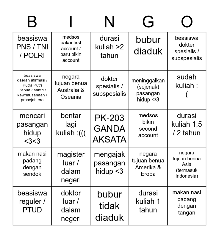 This bingo card has a free space and 24 words: magister luar / dalam negeri, doktor luar / dalam negeri, dokter spesialis / subspesialis, beasiswa reguler / PTUD, beasiswa dokter spesialis / subspesialis, beasiswa PNS / TNI / POLRI, beasiswa daerah afirmasi / Putra Putri Papua / santri / kewriausahaan / prasejahtera, medsos pakai first account / baru bikin account, medsos bikin second account, mengajak pasangan hidup <3, meninggalkan (sejenak) pasangan hidup </3, mencari pasangan hidup <3<3, negara tujuan benua Amerika & Eropa, negara tujuan benua Asia (termasuk Indonesia), negara tujuan benua Australia & Oseania, durasi kuliah 1 tahun, durasi kuliah 1,5 / 2 tahun, durasi kuliah >2 tahun, sudah kuliah :(, bentar lagi kuliah :(((, makan nasi padang dengan tangan, makan nasi padang dengan sendok, bubur diaduk and bubur tidak diaduk.