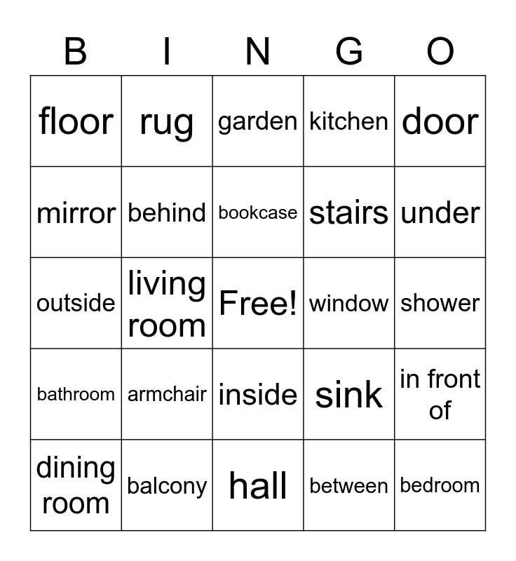 This bingo card has a free space and 24 words: armchair, balcony, bookcase, dining room, door, floor, mirror, rug, window, inside, stairs, outside, sink, in front of, behind, between, shower, garden, under, living room, bedroom, bathroom, kitchen and hall.