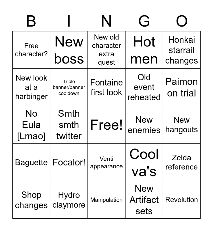 This bingo card has a free space and 24 words: Focalor!, Hydro claymore, Fontaine first look, Shop changes, Honkai starrail changes, Free character?, New look at a harbinger, New boss, New enemies, Venti appearance, Old event reheated, No Eula [Lmao], Cool va's, Zelda reference, Triple banner/banner cooldown, New Artifact sets, New hangouts, New old character extra quest, Paimon on trial, Smth smth twitter, Revolution, Baguette, Hot men and Manipulation.