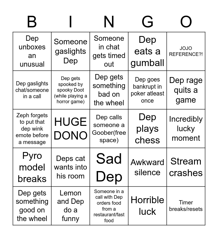 This bingo card has a free space and 24 words: Deps cat wants into his room, Lemon and Dep do a funny, Dep gets something bad on the wheel, Dep gets something good on the wheel, JOJO REFERENCE?!, Dep unboxes an unusual, Dep gaslights chat/someone in a call, Someone gaslights Dep, Dep plays chess, Sad Dep, Dep goes bankrupt in poker atleast once, Zeph forgets to put that dep wink emote before a message, Awkward silence, Stream crashes, Dep gets spooked by spooky Doot (while playing a horror game), Horrible luck, Incredibly lucky moment, Someone in chat gets timed out, Dep rage quits a game, HUGE DONO, Timer breaks/resets, Pyro model breaks, Dep eats a gumball and Someone in a call with Dep orders food from a restaurant/fast food.