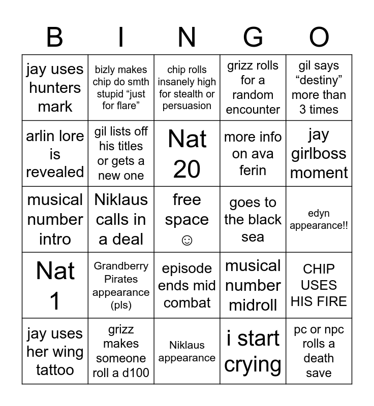 This bingo card has a free space and 24 words: Grandberry Pirates appearance (pls), grizz makes someone roll a d100, Nat 20, jay uses her wing tattoo, gil says “destiny” more than 3 times, jay uses hunters mark, arlin lore is revealed, bizly makes chip do smth stupid “just for flare”, goes to the black sea, episode ends mid combat, more info on ava ferin, musical number intro, musical number midroll, CHIP USES HIS FIRE, gil lists off his titles or gets a new one, i start crying, edyn appearance!!, chip rolls insanely high for stealth or persuasion, jay girlboss moment, Niklaus calls in a deal, pc or npc rolls a death save, Nat 1, grizz rolls for a random encounter and Niklaus appearance.