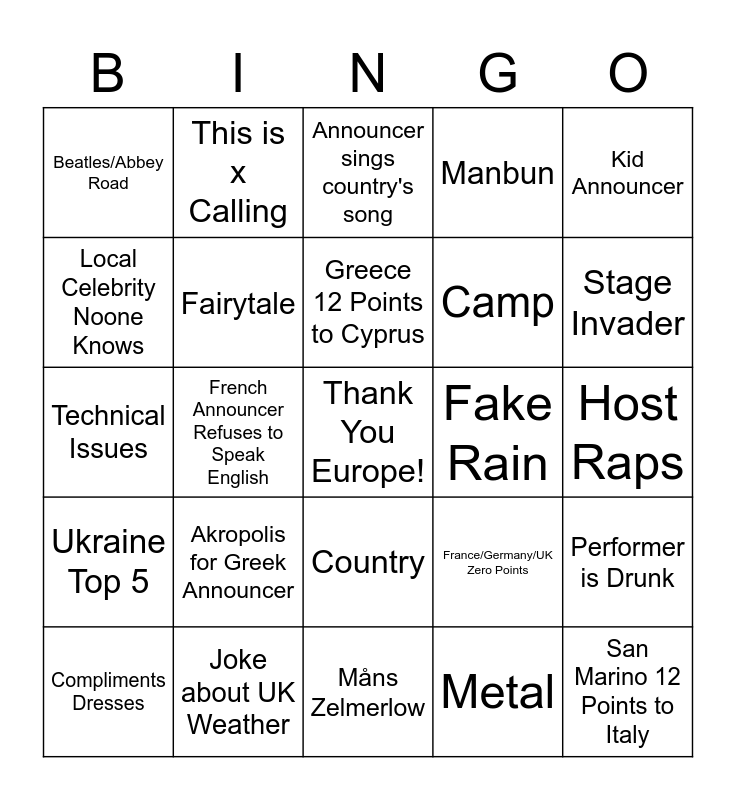 This bingo card has a free space and 36 words: English Accent Attempt, Zelensky Appearance, ABBA Reference, Fairytale, France/Germany/UK Zero Points, Ukraine Top 5, Greece 12 Points to Cyprus, Brexit Reference, Kid Announcer, Gmorning Australia, French Announcer Refuses to Speak English, Manbun, Fire, Fake Rain, Stage Invader, Beatles/Abbey Road, Eiffel Tower for French Announcer, Akropolis for Greek Announcer, San Marino 12 Points to Italy, Announcer sings country's song, Host Raps, Performer is Drunk, Joke about UK Weather, Compliments Dresses, Måns Zelmerlow, This is x Calling, Technical Issues, Drag Queen, Camp, Local Celebrity Noone Knows, Epic Sax Guy, Ethnic Instruments, Metal, Country, Solo Perfomer and Anti War Song.