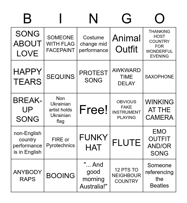 This bingo card has a free space and 24 words: FIRE or Pyrotechnics, BOOING, PROTEST SONG, ANYBODY RAPS, THANKING HOST COUNTRY FOR WONDERFUL EVENING, SONG ABOUT LOVE, HAPPY TEARS, SOMEONE WITH FLAG FACEPAINT, OBVIOUS FAKE INSTRUMENT PLAYING, FUNKY HAT, AWKWARD TIME DELAY, BREAK-UP SONG, FLUTE, EMO OUTFIT AND/OR SONG, SEQUINS, 12 PTS TO NEIGHBOUR COUNTRY, WINKING AT THE CAMERA, Costume change mid performance, SAXOPHONE, Non Ukrainian artist holds Ukrainian flag, Someone referencing the Beatles, non-English country performance is in English, Animal Outfit and "... And good morning Australia!".