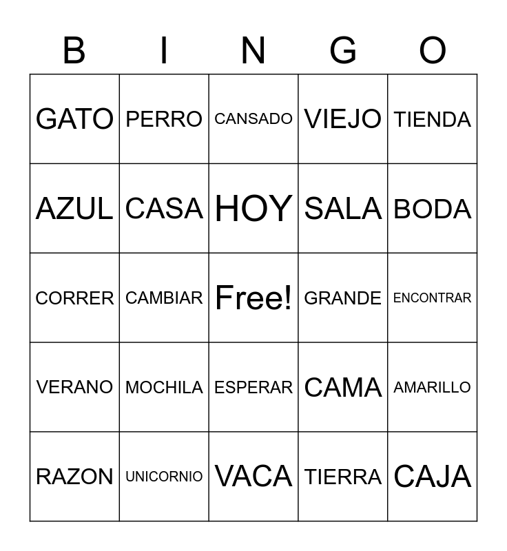 This bingo card has a free space and 24 words: RAZON, MOCHILA, HOY, TIERRA, TIENDA, GATO, PERRO, CANSADO, GRANDE, ENCONTRAR, CORRER, CASA, CAMA, AMARILLO, AZUL, UNICORNIO, VACA, VIEJO, BODA, VERANO, CAMBIAR, ESPERAR, SALA and CAJA.