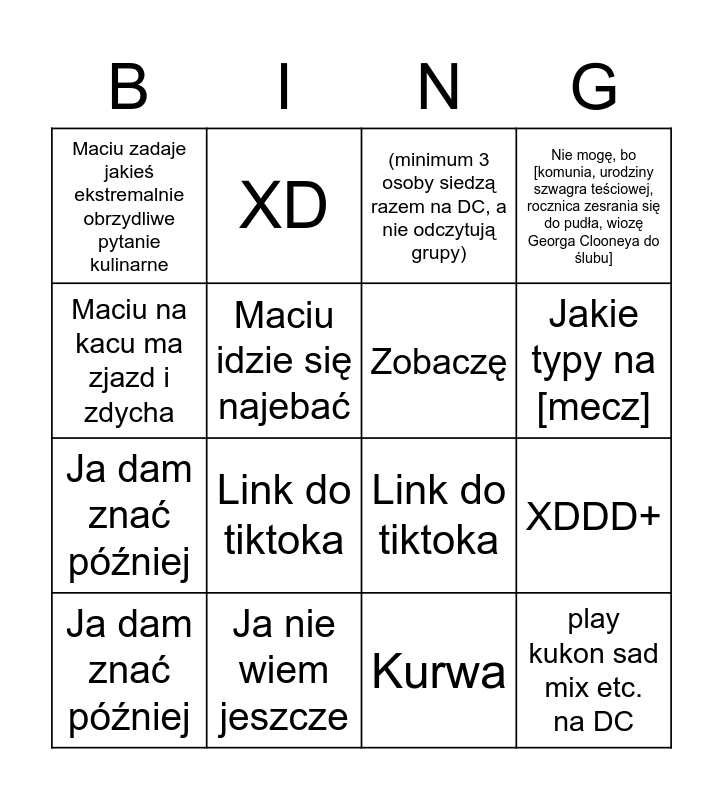 This bingo card has 21 words: Ja nie wiem jeszcze, Ciapek nie pije, XD, Maciu na kacu ma zjazd i zdycha, Kurwa, Zobaczę, Maciu zadaje jakieś ekstremalnie obrzydliwe pytanie kulinarne, (minimum 3 osoby siedzą razem na DC, a nie odczytują grupy), Link do tiktoka, Jakie typy na [mecz], Ja dam znać później, Nie mogę, bo [komunia, urodziny szwagra teściowej, rocznica zesrania się do pudła, wiozę Georga Clooneya do ślubu], play kukon sad mix etc. na DC, XDD+, Maciu idzie się najebać, Link do kuponu fortuna, Ja dam znać później, Link do tiktoka, Maciu na kacu ma zjazd i zdycha, XDDD+ and Ciapek nie pije.