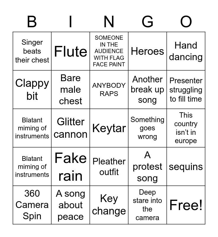 This bingo card has 34 words: Free!, Deep stare into the camera, Talon fingernails, Item of clothing removed, Blatant miming of instruments, Bare male chest, Hand dancing, 360 Camera Spin, Flute, UK presenter speaks in Ukrainian, ANYBODY RAPS, SOMEONE IN THE AUDIENCE WITH FLAG FACE PAINT, Whistling, Winking at the camera, Something goes wrong, Presenter struggling to fill time, A song about peace, Blatant miming of instruments, Fake rain, A protest song, Pleather outfit, Twelve points to a neighbor, Singer beats their chest, This country isn’t in europe, Key change, Keytar, Heroes, Booking, Another break up song, Clappy bit, A song about love, Glitter cannon, sequins and The mersey.