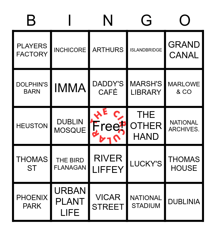 This bingo card has a free space and 75 words: ALL MY FRIENDS, ÁRAS AN UACHTARÁIN, ARTHURS, BIBI'S, BITE OF LIFE, BLACKPITTS, BLOCK T, CHRIST CHURCH, CITY WALLS, CLANBRASSIL ST, CORK STREET, CORNMARKET, DADDY'S CAFÉ, DOLPHIN'S BARN, DONORE BOXING CLUB, DUBLIN MOSQUE, DUBLIN ZOO, DUBLINIA, FATIMA, GRAND CANAL, HEN'S TEETH, HEUSTON, IMMA, INCHICORE, ISLANDBRIDGE, JAMES GATE, JEWISH MUSEUM, KILMAINHAM GAOL, LEO BURDOCK, LIBERTIES, LITTLE FLOWER, LORD EDDWARD, LOWES, LUCKY'S, MARLOWE & CO, MARSH'S LIBRARY, MEATH STREET, MVP, NATIONAL ARCHIVES., NATIONAL STADIUM, NEWMARKET SQUARE, OPEN GATE BREWERY, OSPIDÉAL SAN SÉAMAS, PALLAS STUDIOS, PEACE PARK, PEARSE LYONS, PHOENIX PARK, PLAYERS FACTORY, PORTOBELLO, RIALTO, RICHMOND BARRACKS, RIVER LIFFEY, ROE & CO, SALLY'S BRIDGE, ST AUDEON'S, ST KEVIN'S, ST PATRICK'S AFC, ST PATRICK'S CATHEDRAL, ST WERBURGH'S, TEELINGS, THE BIRD FLANAGAN, THE BRAZEN HEAD, THE CIRCULAR, THE COOMBE, THE MAGNET, THE OTHER HAND, THE ROYAL OAK, THE STOREHOUSE, THE TENTERS, THOMAS HOUSE, THOMAS ST, URBAN PLANT LIFE, USHER'S QUAY, VICAR STREET and WAR MEMORIAL GARDENS.