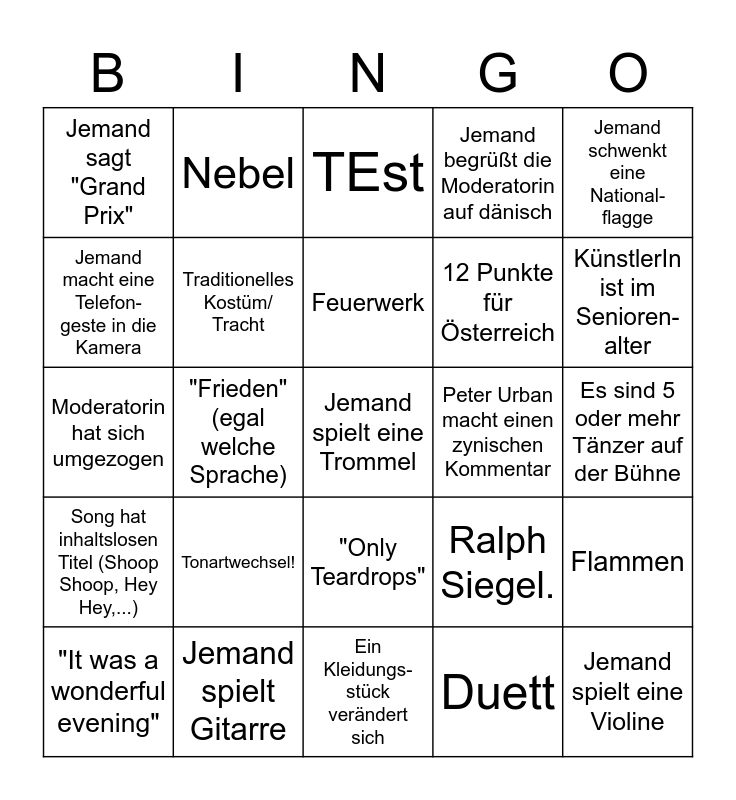 This bingo card has 29 words: "It was a wonderful evening", "Thank you for a fantastic show", "Frieden" (egal welche Sprache), Jemand spielt eine Violine, Jemand sagt "Grand Prix", TEst, Traditionelles Kostüm/ Tracht, Tonartwechsel!, Peter Urban macht einen zynischen Kommentar, Jemand spielt Gitarre, Es sind 5 oder mehr Tänzer auf der Bühne, Jemand spielt eine Trommel, Ein Kleidungs-stück verändert sich, Duett, KünstlerIn ist im Senioren-alter, Künstler singt in der Landes-sprache, "Only Teardrops", Song hat inhaltslosen Titel (Shoop Shoop, Hey Hey,...), Jemand schwenkt eine National-flagge, Moderatorin hat sich umgezogen, Ralph Siegel., 12 Punkte für Deutsch-land, 12 Punkte für Österreich, Jemand macht eine Telefon-geste in die Kamera, Jemand begrüßt die Moderatorin auf dänisch, Nebel, Flammen, Feuerwerk and Konfetti.