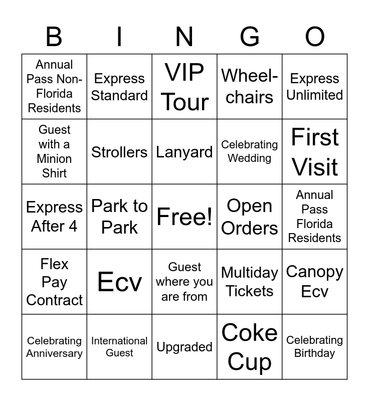 This bingo card has a free space and 24 words: Ecv, International Guest, Lanyard, Celebrating Anniversary, Express Unlimited, Annual Pass Non- Florida Residents, Guest with a Minion Shirt, Express Standard, Open Orders, Guest where you are from, Celebrating Wedding, Express After 4, Multiday Tickets, Canopy Ecv, Strollers, Coke Cup, Annual Pass Florida Residents, VIP Tour, First Visit, Park to Park, Celebrating Birthday, Flex Pay Contract, Wheel-chairs and Upgraded.