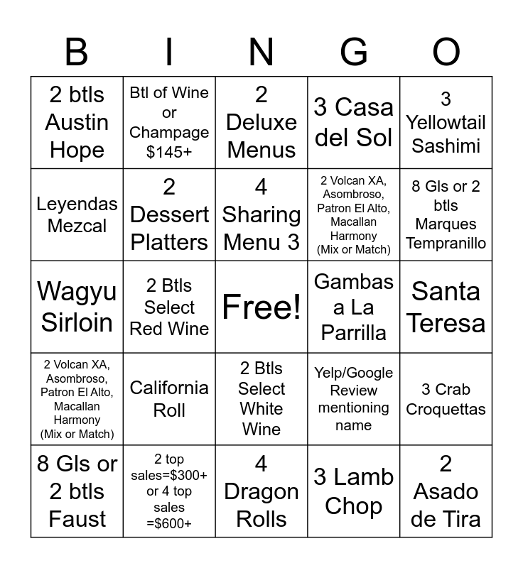 This bingo card has a free space and 24 words: California Roll, 2 top sales=$300+ or 4 top sales =$600+, 4 Sharing Menu 3, 8 Gls or 2 btls Faust, 3 Yellowtail Sashimi, 2 btls Austin Hope, Leyendas Mezcal, Btl of Wine or Champage $145+, Gambas a La Parrilla, 2 Btls Select White Wine, 2 Volcan XA, Asombroso, Patron El Alto, Macallan Harmony (Mix or Match), Wagyu Sirloin, Yelp/Google Review mentioning name, 3 Crab Croquettas, 2 Dessert Platters, 3 Lamb Chop, Santa Teresa, 2 Deluxe Menus, 8 Gls or 2 btls Marques Tempranillo, 2 Btls Select Red Wine, 2 Asado de Tira, 2 Volcan XA, Asombroso, Patron El Alto, Macallan Harmony (Mix or Match), 3 Casa del Sol and 4 Dragon Rolls.