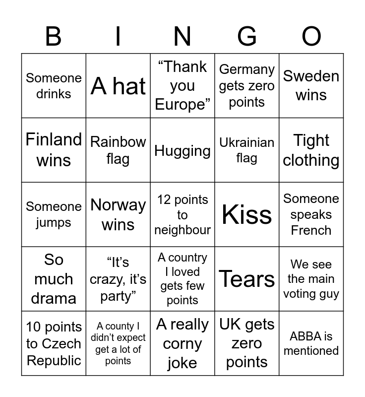 This bingo card has a free space and 24 words: “It’s crazy, it’s party”, A county I didn’t expect get a lot of points, Hugging, 10 points to Czech Republic, Sweden wins, Someone drinks, Finland wins, A hat, Kiss, A country I loved gets few points, Ukrainian flag, Someone jumps, Tears, We see the main voting guy, Rainbow flag, UK gets zero points, Someone speaks French, “Thank you Europe”, Tight clothing, Norway wins, ABBA is mentioned, So much drama, Germany gets zero points and A really corny joke.