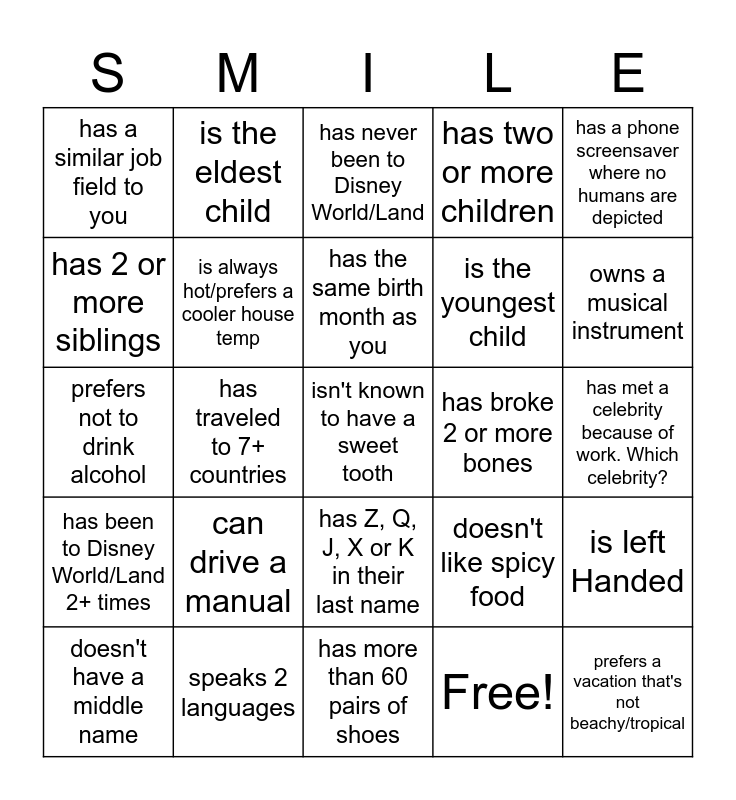 This bingo card has 30 words: speaks 2 languages, prefers to go by their nickname...Which is?, has traveled to 7+ countries, has a bday on a holiday, has a similar job field to you, has never been to Disney World/Land, is always hot/prefers a cooler house temp, has Z, Q, J, X or K in their last name, has broke 2 or more bones, has more than 60 pairs of shoes, has met a celebrity because of work. Which celebrity?, isn't known to have a sweet tooth, Free!, prefers a vacation that's not beachy/tropical, owns a musical instrument, has more than 500 songs downloaded on their phone, doesn't like spicy food, has been to Disney World/Land 2+ times, can drive a manual, has a phone screensaver where no humans are depicted, prefers not to drink alcohol, doesn't live in the same state they grew up in, is the eldest child, is the youngest child, has 2 or more siblings, has two or more children, is left Handed, doesn't have a middle name, has the same birth month as you and has a food allergy.