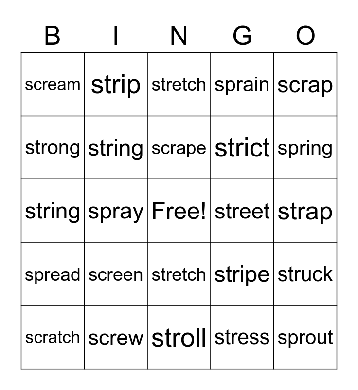 This bingo card has a free space and 24 words: screen, screw, scrape, scratch, scrap, scream, strong, strip, street, stretch, strict, string, stripe, struck, string, stress, strap, stretch, spring, spray, sprout, spread, sprain and stroll.