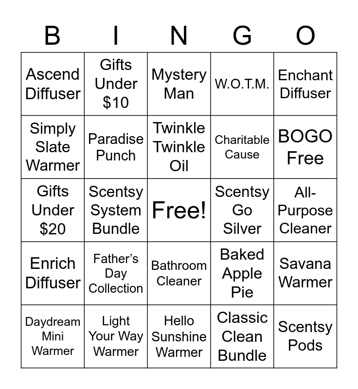 This bingo card has a free space and 35 words: Scentsy Go Rose Gold, Dryer Discs, Bathroom Cleaner, W.O.T.M., All-Purpose Cleaner, Simply Slate Warmer, Father’s Day Collection, Hello Sunshine Warmer, Charitable Cause, Scentsy Pods, Enrich Diffuser, Scentsy System Bundle, Eucalyptus Oil, Awesome Apple Oil, Ascend Diffuser, Light Your Way Warmer, Twinkle Twinkle Oil, Scentsy Go Silver, Enchant Diffuser, Daydream Mini Warmer, Clean Breeze, Baked Apple Pie, Savana Warmer, Rainbow Sherbet, Paradise Punch, Mystery Man, Perfect Scentsy Bundle, Laundry Love Bundle, Gifts Under $20, Body Wash, Skinny Dippin’, Classic Clean Bundle, BOGO Free, Gifts Under $10 and S.O.T.M..