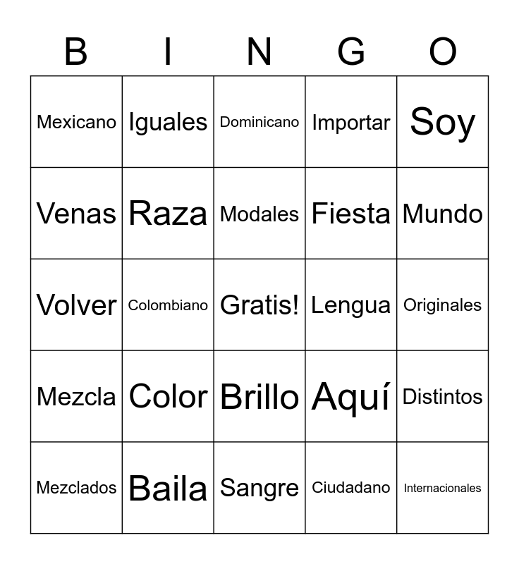 This bingo card has a free space and 29 words: Mezclados, Corazón, Colombiano, Americano, Mexicano, Dominicano, Raza, Color, Lengua, Baila, Originales, Internacionales, Sangre, Ciudadano, Mundo, Lugar, Brillo, Mezcla, Soy, Volver, Aquí, Sentir, Fiesta, Venas, Importar, Iguales, Distintos, Modales and Súper.