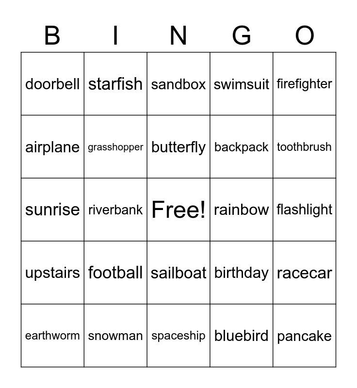 This bingo card has a free space and 24 words: football, snowman, butterfly, earthworm, firefighter, doorbell, airplane, starfish, rainbow, sailboat, backpack, sunrise, birthday, racecar, grasshopper, bluebird, flashlight, sandbox, toothbrush, riverbank, pancake, upstairs, swimsuit and spaceship.