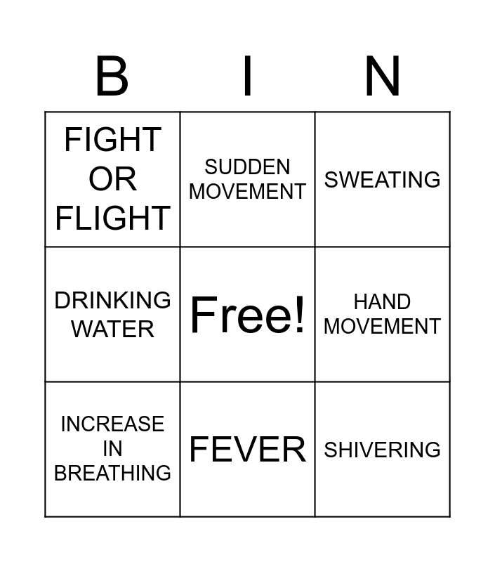 This bingo card has a free space and 8 words: DRINKING WATER, SUDDEN MOVEMENT, HAND MOVEMENT, INCREASE IN BREATHING, SWEATING, FIGHT OR FLIGHT, FEVER and SHIVERING.