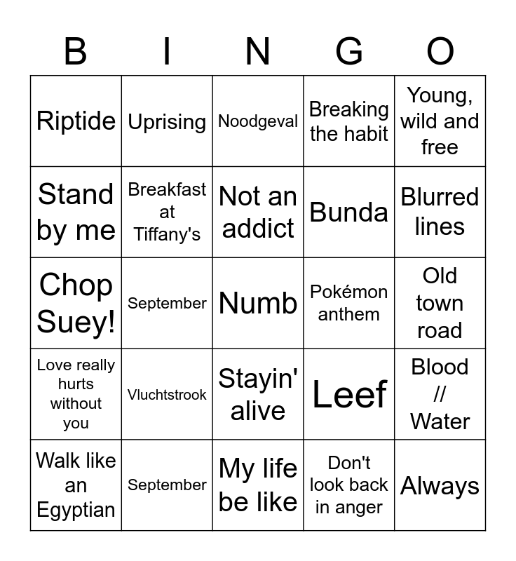 This bingo card has a free space and 24 words: Vluchtstrook, September, Not an addict, Walk like an Egyptian, Young, wild and free, Riptide, Stand by me, Uprising, Pokémon anthem, Stayin' alive, Bunda, Chop Suey!, Leef, Blood // Water, Breakfast at Tiffany's, Don't look back in anger, Old town road, Noodgeval, Blurred lines, September, Always, Love really hurts without you, Breaking the habit and My life be like.
