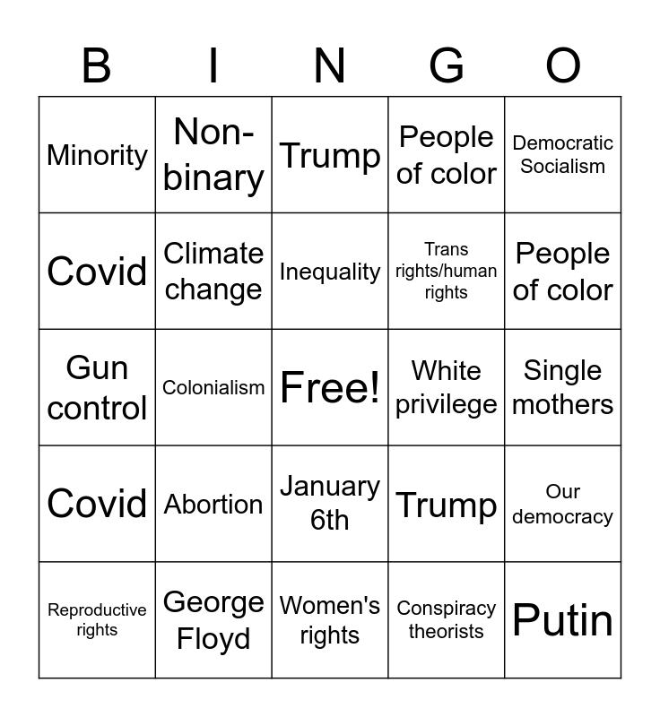 This bingo card has a free space and 50 words: Ukraine, Putin, Gender pay gap, Women's rights, Abortion, Gun control, Non-binary, Racism, Covid, Vaccine/Anti-vax, Climate change, People of color, Our democracy, Trump, January 6th, Diversity, Inequality, White privilege, Slavery, Democratic Socialism, Colonialism, Conspiracy theorists, Minority, Trans rights/human rights, Single mothers, Climate change, People of color, Our democracy, Trump, January 6th, Diversity, Inequality, White privilege, Slavery, George Floyd, Hitler/Nazis, Conspiracy theorists, Minority, Trans rights/human rights, Single mothers, Ukraine, Putin, Gender pay gap, Women's rights, Reproductive rights, Gun control, Non-binary, Racism, Covid and Vaccine/Anti-vax.