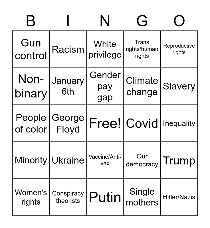 This bingo card has a free space and 25 words: Ukraine, Putin, Gender pay gap, Women's rights, Reproductive rights, Gun control, Non-binary, Racism, Covid, Vaccine/Anti-vax, Climate change, People of color, Our democracy, Trump, January 6th, Diversity, Inequality, White privilege, Slavery, George Floyd, Hitler/Nazis, Conspiracy theorists, Minority, Trans rights/human rights and Single mothers.