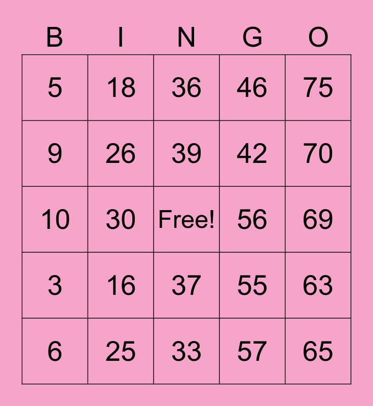 This bingo card has a free space and 24 words: 6, 16, 39, 57, 75, 5, 18, 36, 56, 69, 10, 26, 55, 63, 9, 25, 33, 46, 70, 3, 30, 37, 42 and 65.