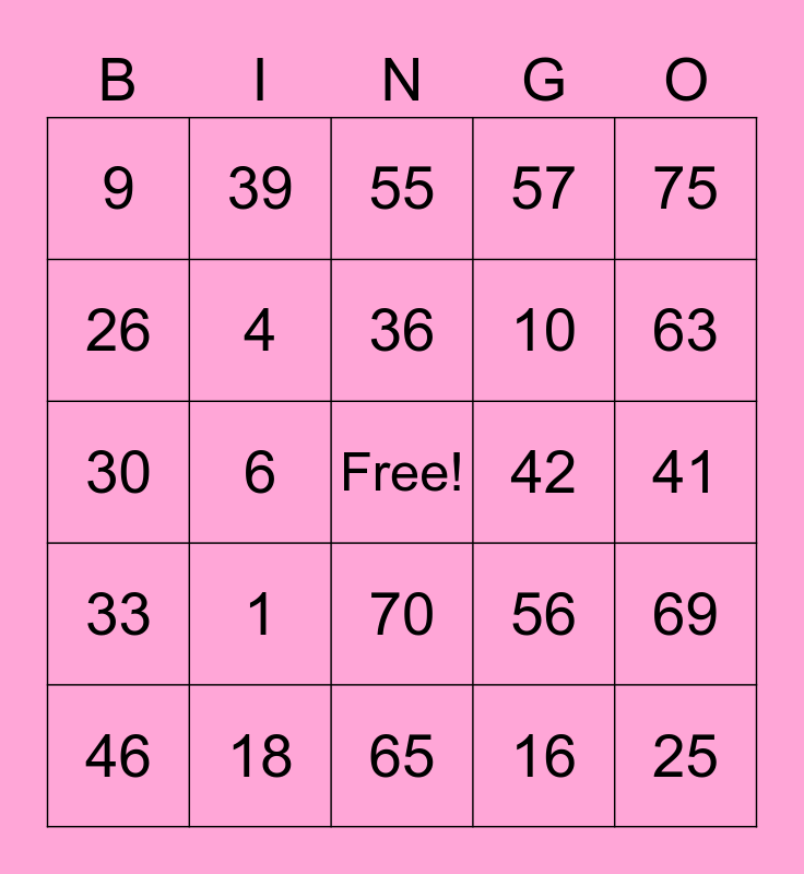 This bingo card has a free space and 24 words: 1, 18, 36, 46, 75, 9, 26, 39, 42, 70, 10, 30, 56, 69, 4, 16, 41, 55, 63, 6, 25, 33, 57 and 65.