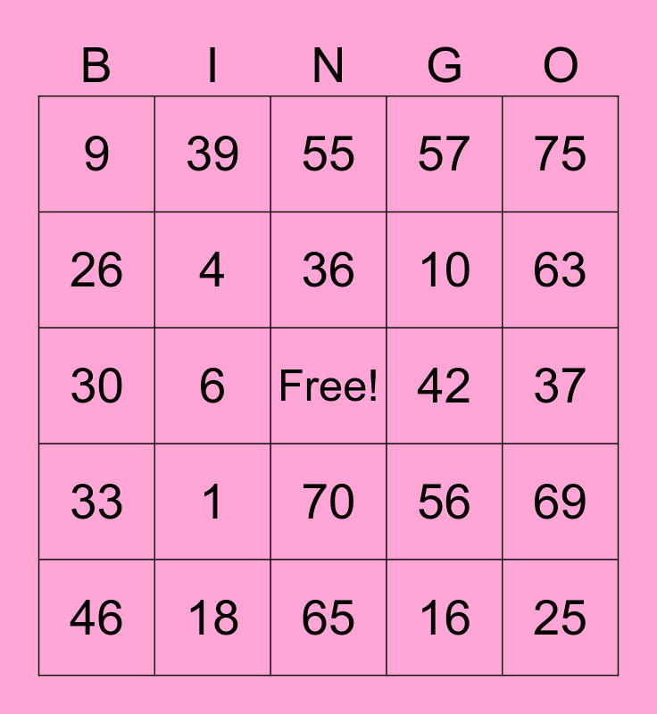 This bingo card has a free space and 24 words: 1, 18, 36, 46, 75, 9, 26, 39, 42, 70, 10, 30, 56, 69, 4, 16, 37, 55, 63, 6, 25, 33, 57 and 65.