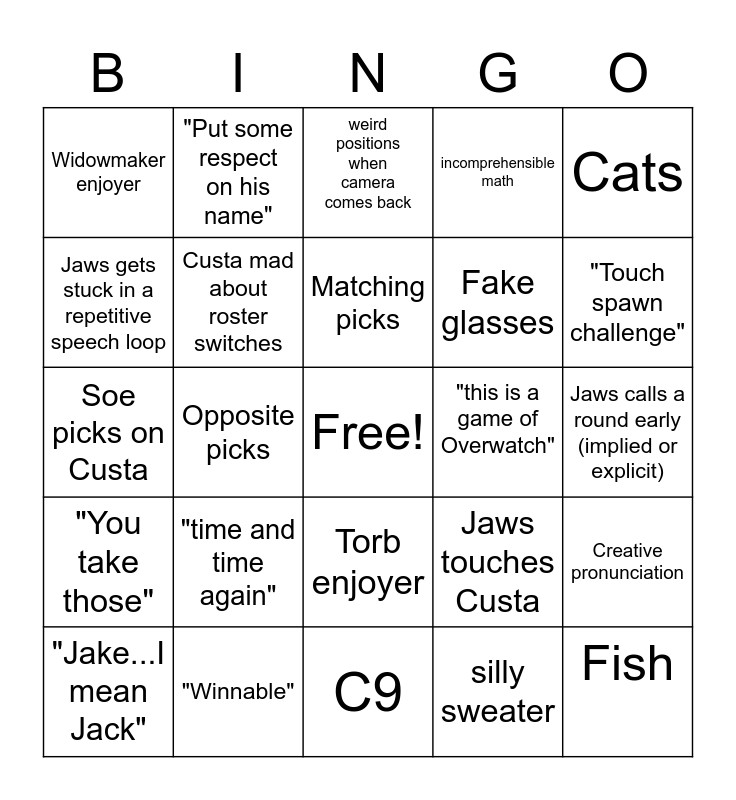 This bingo card has a free space and 24 words: "time and time again", "Winnable", Matching picks, "Jake...I mean Jack", Cats, Widowmaker enjoyer, Jaws gets stuck in a repetitive speech loop, "Put some respect on his name", "this is a game of Overwatch", Torb enjoyer, Fake glasses, Soe picks on Custa, Jaws touches Custa, Creative pronunciation, Custa mad about roster switches, silly sweater, Jaws calls a round early (implied or explicit), weird positions when camera comes back, "Touch spawn challenge", Opposite picks, Fish, "You take those", incomprehensible math and C9.