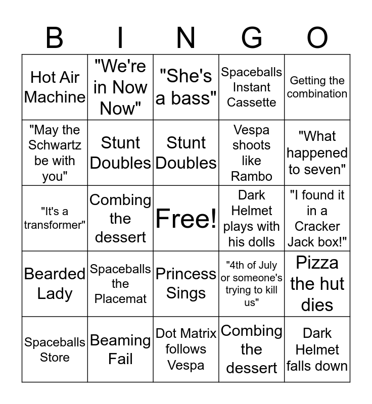 This bingo card has a free space and 24 words: Spaceballs the Placemat, Beaming Fail, Stunt Doubles, Spaceballs Store, Getting the combination, Hot Air Machine, "May the Schwartz be with you", "We're in Now Now", Dark Helmet plays with his dolls, Princess Sings, Vespa shoots like Rambo, "It's a transformer", "4th of July or someone's trying to kill us", Pizza the hut dies, Stunt Doubles, Combing the dessert, "I found it in a Cracker Jack box!", "She's a bass", "What happened to seven", Combing the dessert, Dark Helmet falls down, Bearded Lady, Spaceballs Instant Cassette and Dot Matrix follows Vespa.