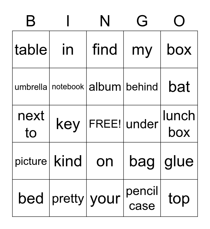This bingo card has a free space and 24 words: kind, pretty, album, bed, box, table, umbrella, in, under, on, behind, next to, bag, glue, notebook, pencil case, lunch box, find, bat, key, top, picture, my and your.