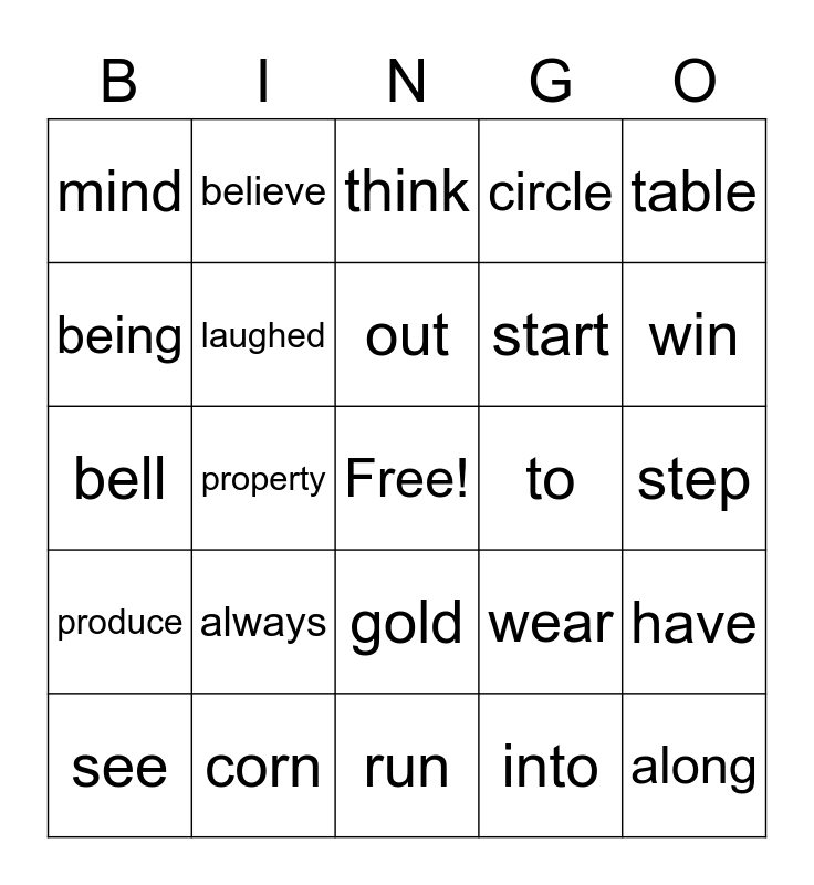 This bingo card has a free space and 24 words: always, corn, out, see, table, mind, being, believe, to, gold, start, bell, wear, have, laughed, into, step, think, win, property, along, produce, circle and run.