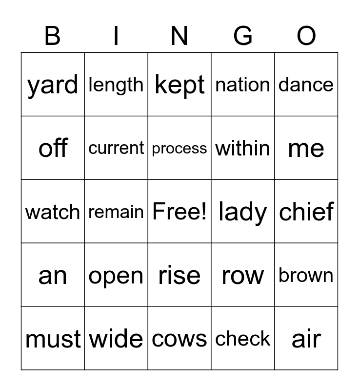 This bingo card has a free space and 24 words: open, wide, process, must, dance, yard, off, length, lady, rise, within, watch, row, brown, current, check, chief, kept, me, remain, air, an, nation and cows.