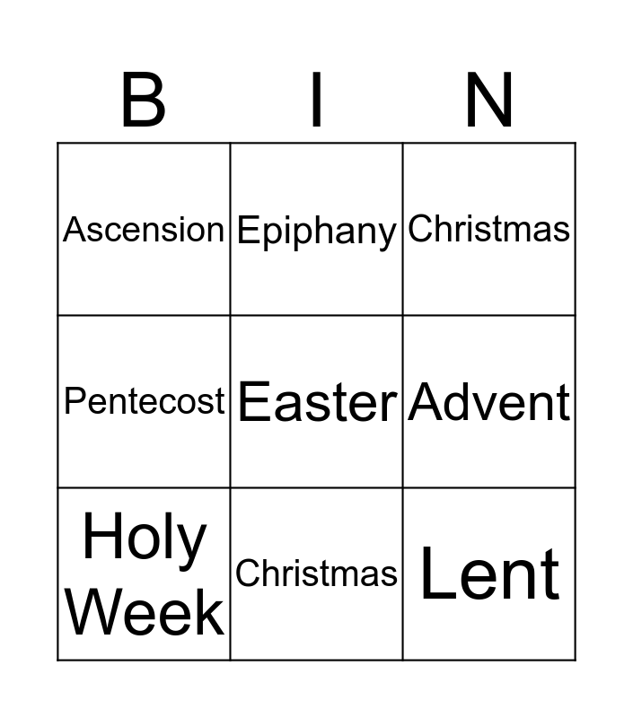 This bingo card has a free space and 8 words: Advent, Christmas, Epiphany, Holy Week, Ascension, Lent, Pentecost and Christmas.