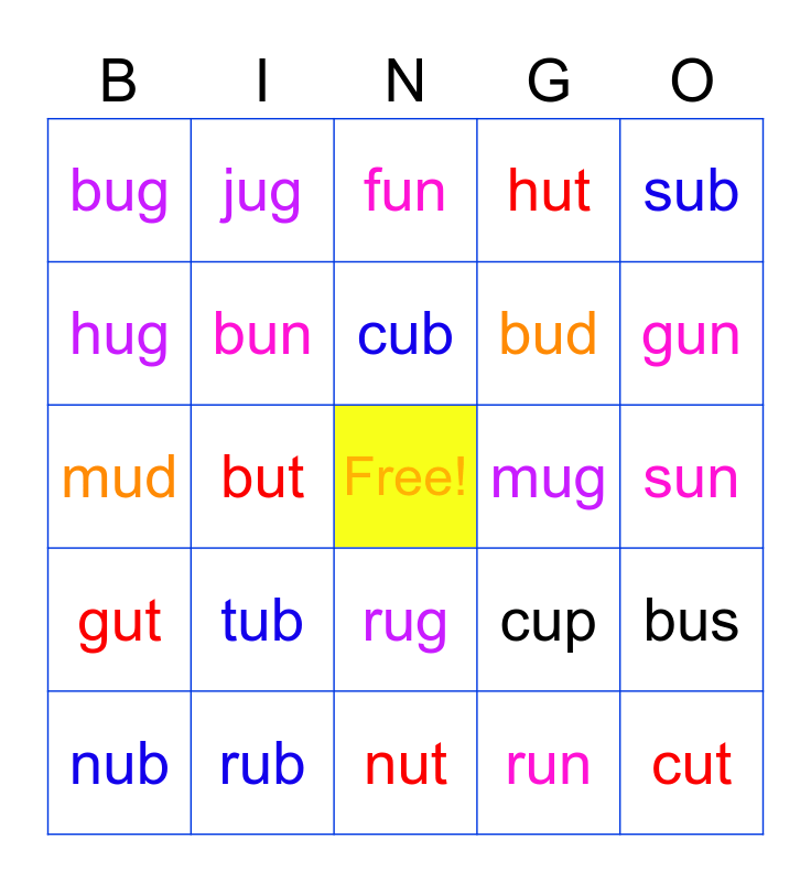 This bingo card has a free space and 24 words: tub, rub, cub, nub, sub, bug, hug, jug, mug, rug, bud, mud, cup, bus, bun, run, sun, fun, gun, but, cut, gut, hut and nut.