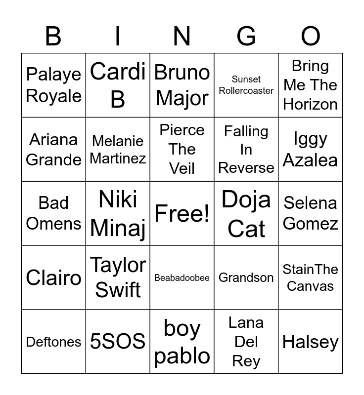 This bingo card has a free space and 24 words: Taylor Swift, 5SOS, Pierce The Veil, Deftones, Bring Me The Horizon, Palaye Royale, Ariana Grande, Cardi B, Doja Cat, Beabadoobee, Falling In Reverse, Bad Omens, Grandson, StainThe Canvas, Melanie Martinez, Lana Del Rey, Selena Gomez, Bruno Major, Iggy Azalea, Niki Minaj, Halsey, Clairo, Sunset Rollercoaster and boy pablo.