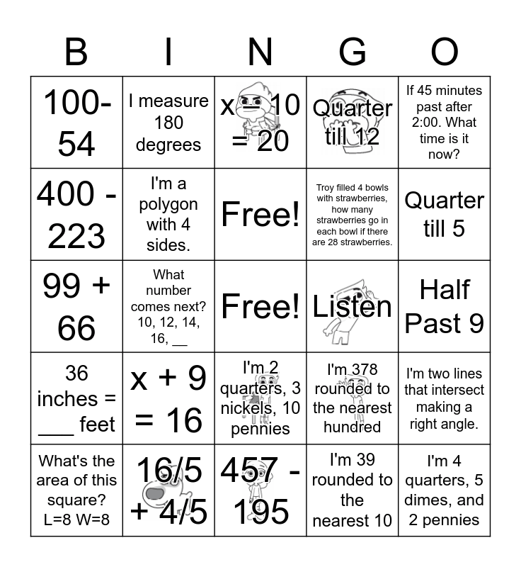 This bingo card has 7 images, a free space and 24 words: What's the area of this square? L=8 W=8, x + 9 = 16, Free!, I'm 39 rounded to the nearest 10, If 45 minutes past after 2:00. What time is it now?, 100-54, I measure 180 degrees, x – 10 = 20, Listen, Half Past 9, 99 + 66, I'm a polygon with 4 sides., I'm 378 rounded to the nearest hundred, I'm two lines that intersect making a right angle., 400 - 223, 16/5 + 4/5, 457 - 195, Quarter till 12, Quarter till 5, 36 inches = ___ feet, What number comes next? 10, 12, 14, 16, __, I'm 2 quarters, 3 nickels, 10 pennies, Troy filled 4 bowls with strawberries, how many strawberries go in each bowl if there are 28 strawberries. and I'm 4 quarters, 5 dimes, and 2 pennies.
