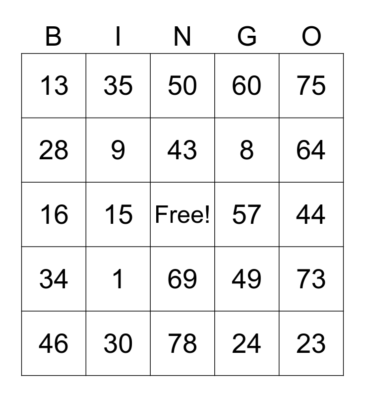 This bingo card has a free space and 24 words: 1, 30, 43, 46, 75, 13, 28, 35, 57, 69, 8, 16, 49, 73, 9, 24, 44, 50, 64, 15, 23, 34, 60 and 78.