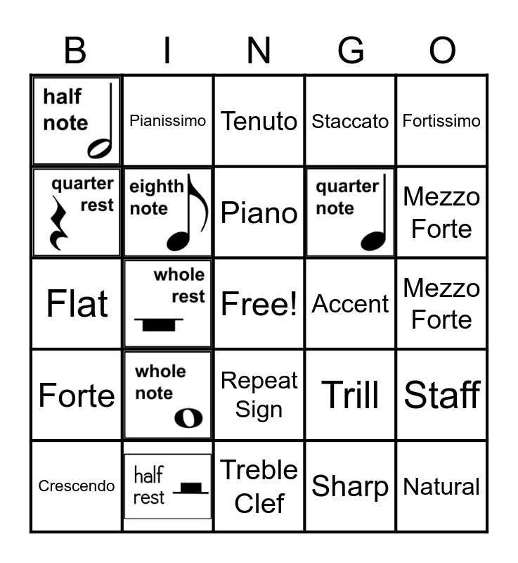 This bingo card has 7 images, a free space and 17 words: Piano, Crescendo, Fortissimo, Pianissimo, Accent, Repeat Sign, Flat, Trill, Staff, Sharp, Mezzo Forte, Tenuto, Mezzo Forte, Natural, Forte, Staccato and Treble Clef.