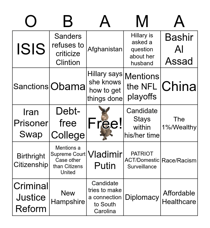 This bingo card has a free space and 24 words: Mentions a Supreme Court Case other than Citizens United, New Hampshire, Hillary says she knows how to get things done, Criminal Justice Reform, Bashir Al Assad, ISIS, Sanctions, Sanders refuses to criticize Clintion, Candidate Stays within his/her time, Vladimir Putin, Mentions the NFL playoffs, Iran Prisoner Swap, PATRIOT ACT/Domestic Surveillance, Race/Racism, Obama, Diplomacy, The 1%/Wealthy, Afghanistan, China, Debt-free College, Affordable Healthcare, Birthright Citizenship, Hillary is asked a question about her husband and Candidate tries to make a connection to South Carolina.