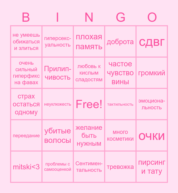 This bingo card has a free space and 24 words: убитые волосы, проблемы с самооценкой, любовь к кислым сладостям, mitski<3, сдвг, не умеешь обижаться и злиться, очень сильный гиперфикс на фавах, гиперсекс-уальность, тактильность, желание быть нужным, частое чувство вины, страх остаться одному, много косметики, очки, Прилип-чивость, тревожка, эмоциона-льность, плохая память, громкий, неуклюжесть, пирсинг и тату, переедание, доброта and Сентимен-тальность.