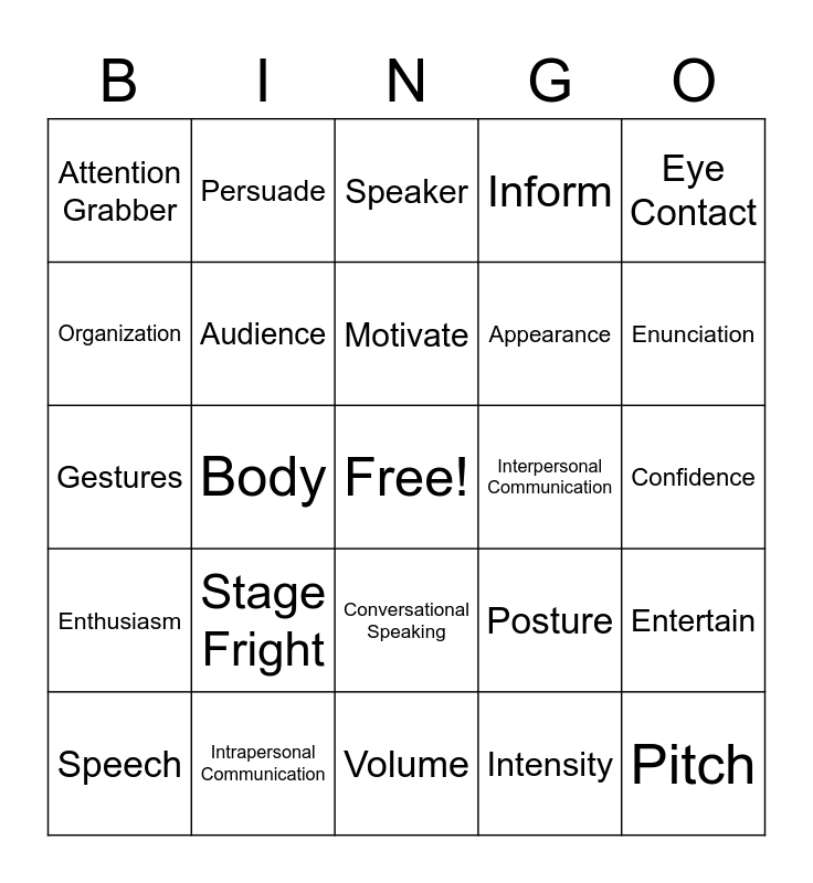 This bingo card has a free space and 29 words: Speech, Introduction, Body, Conclusion, Attention Grabber, Speaker, Audience, Stage Fright, Interpersonal Communication, Intrapersonal Communication, Confidence, Pitch, Volume, Intensity, Enunciation, Rate, Conversational Speaking, Enthusiasm, Eye Contact, Gestures, Posture, Timing, Appearance, Organization, Inform, Persuade, Entertain, Motivate and Topically.