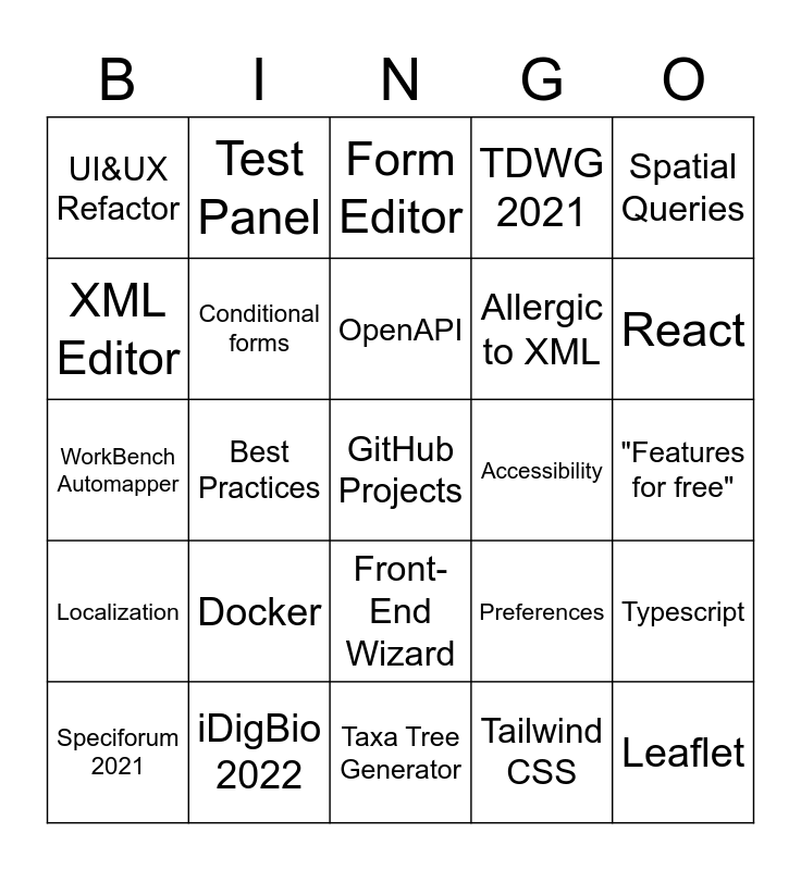 This bingo card has 27 words: Preferences, Leaflet, Allergic to XML, Taxa Tree Generator, XML Editor, Form Editor, Test Panel, Localization, Accessibility, Typescript, WorkBench Automapper, TDWG 2021, Speciforum 2021, iDigBio 2022, React, Code refactoring, Conditional forms, OpenAPI, Docker, UI&UX Refactor, "Features for free", Tailwind CSS, Best Practices, GitHub Projects, Front-End Wizard, Spatial Queries and Automated Tests.
