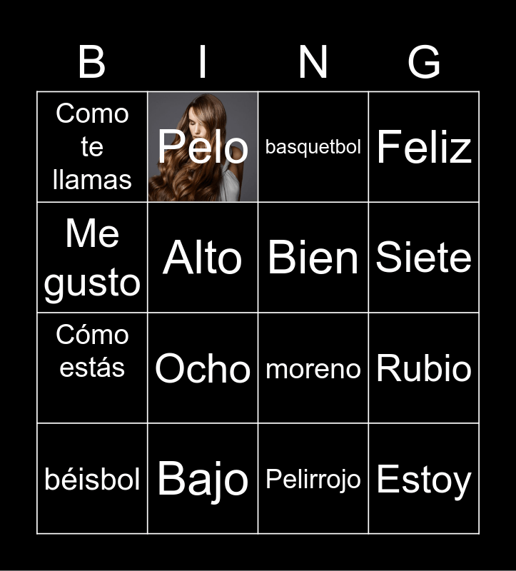 This bingo card has 2 images and 27 words: Hola, Cómo estás, Uno, Alto, basquetbol, Pelo, Estoy, Bajo, Free!, moreno, Feliz, Fútbol americano, Seiz, Ocho, Gracias, Azul, Bien, Siete, Adios, Como te llamas, Señora, béisbol, Rubio, Pelirrojo, Los Deportes, Me gusto and Música.