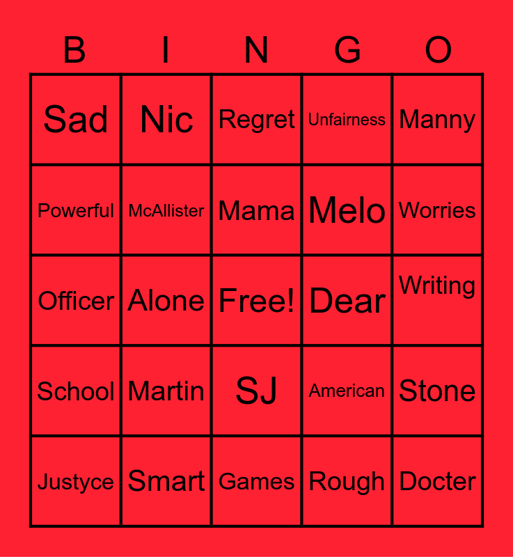 This bingo card has a free space and 24 words: Martin, Smart, Mama, Justyce, Manny, Sad, Powerful, Nic, Dear, SJ, Melo, Officer, American, Stone, McAllister, Rough, Writing, Regret, Worries, Alone, Docter, School, Unfairness and Games.